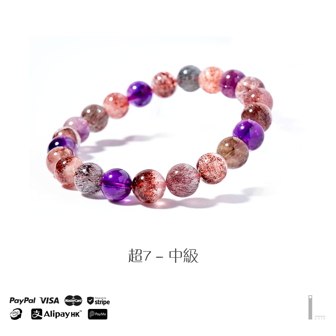 超級七(Super Seven)是一種產量極少,擁有高頻率能量強大的水晶,水晶能量在水晶家族最排名數一數二,它同時共生了七種礦物,包含紫水晶,茶晶,白水晶,黃磷鐡,所以被稱為超級七。超級七對應人體七個不同脈輪,有助於七個脈輪能量的平衡,因此功效全面,超級七也具罕有的聯效功能,與其他晶石一起配戴,可以放大其他晶石的能量,功效更明顯。它是為身心帶來好運的全方位水晶,作為入門的水晶是很好的選擇。